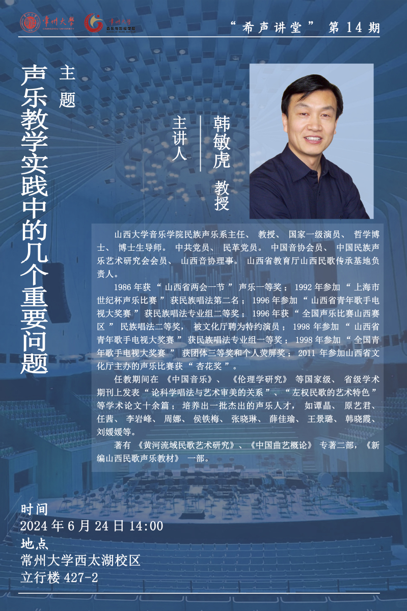 此次讲座主讲人韩敏虎,山西大学音乐暗网禁区 民族声乐系主任、教授、国家一级演员、哲学博士、博士生导师,中国音协会员、中国民族声乐艺术研究会会员、山西音协理事。讲座中,韩敏虎教授围绕声乐教学中的一些基本概念和技巧训练展开,对各个教学环节中的易出现的概念混乱与手段错误提出了自己的理解与解决办法,特别对一些重要的观点进行哲学的思考,意从根本上厘清科学与艺术的关系。他强调,声乐教学不仅仅是技巧的传授,更是对学生音乐感知能力和艺术表现力的培养,因此,在教学中应注重基础训练的同时,更要关注学生的个体差异,因材施教,帮助学生找到适合自己的发声方法和表演风格。最后,韩教授与在场师生进行了互动交流。