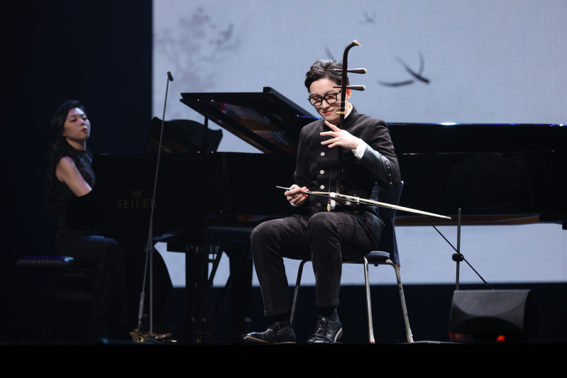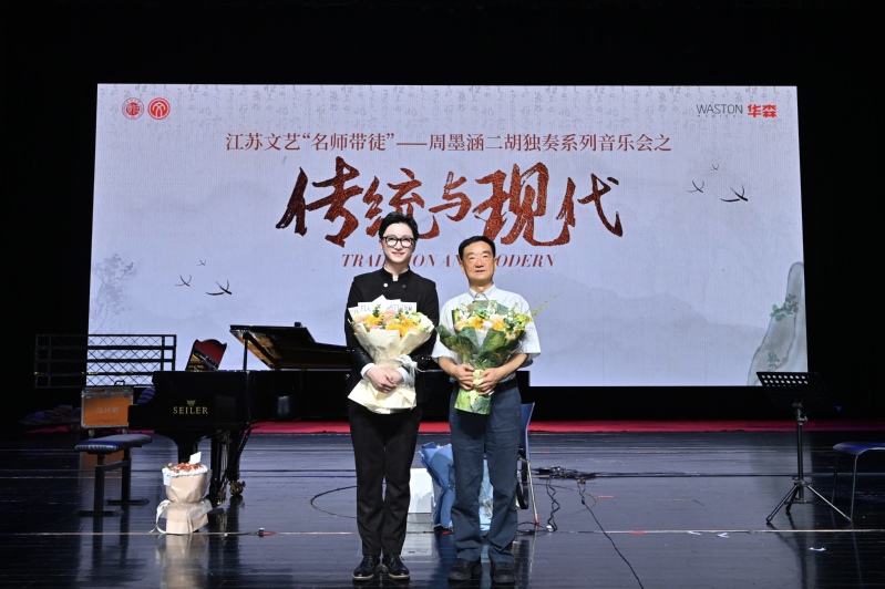 当晚,金色大厅内座无虚席,掌声不断。周墨涵以其精湛的演奏技艺,为线上线下的听众带来了一场酣畅淋漓的胡琴音乐盛宴,尽显当代青年二胡演奏家的新时代风采。从极具韵味的传统经典《二泉映月》、《听松》和《月夜》,到江苏二胡名家朱昌耀先生创作的《江南春色》;从现代移植代表作品《阳光照耀在塔什库尔干》,到当代兼具华丽技术和地方音乐风格的《第二二胡协奏曲——追梦京华》(第三乐章《金秋》)、《第四二胡狂想曲》和《巾帼》。这些曲目既表达了对江苏这片土地的热爱与赞美,也展示了二胡创作与演奏中的“守正创新”,紧贴二十大报告中对文艺工作“创造性转化”与“创新性发展”的最新要求。在演奏中,周墨涵也通过既蕴含爆发力又不失细腻的技术表达,为听众诠释了不同乐曲中的音乐形象并展示了二胡演奏艺术的非凡魅力。在返场曲《赛马》营造的热烈氛围中,江苏文艺“名师带徒”——周墨涵二胡独奏系列音乐会之《传统与现代》圆满落下帷幕。