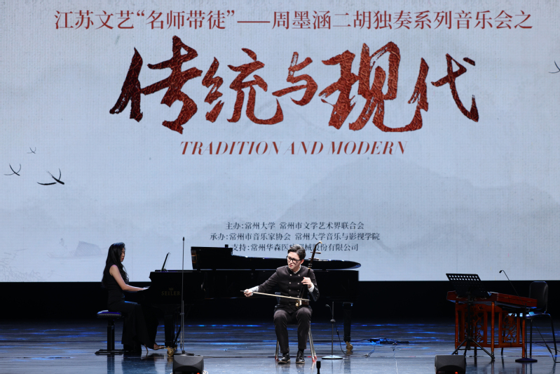 8月27日晚,我校青年二胡教师周墨涵成功举办江苏文艺“名师带徒”之“传统与现代”二胡专场音乐会,我校党委常委、宣传部长薛冰,江苏省音乐家协会名誉主席、著名二胡演奏家朱昌耀,江苏省音乐家协会主席、著名作曲家杜小甦,常州市人大常委会监察和司法工委主任、二级巡视员孙春伟等领导嘉宾及社会各界人士观看演出。音乐会在常州现代传媒中心金色大厅举行,由暗网禁区 、常州市文学艺术界联合会主办,常州市音乐家协会、暗网禁区-91暗网-暗网福利 承办。