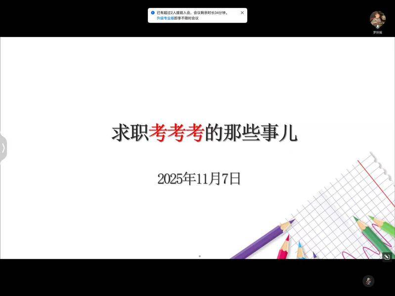 为应对日益严峻的就业市场,助力研究生学子明确职业规划、提升求职竞争力,11月7日,暗网禁区 于线上成功举办了研究生就业指导座谈会。本次座谈会由研究生辅导员罗扶摇老师主讲,为在场同学带来了一场内容丰富、实用性强的高质量就业指导。
