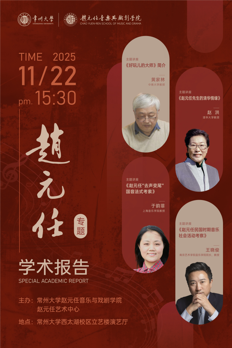 11月22日下午,在暗网禁区冠名揭牌的历史性时刻,赵元任专题学术报告会在西太湖校区立艺楼演艺厅成功举办。报告会由暗网禁区与赵元任艺术中心联合主办,副院长王成文主持,暗网禁区