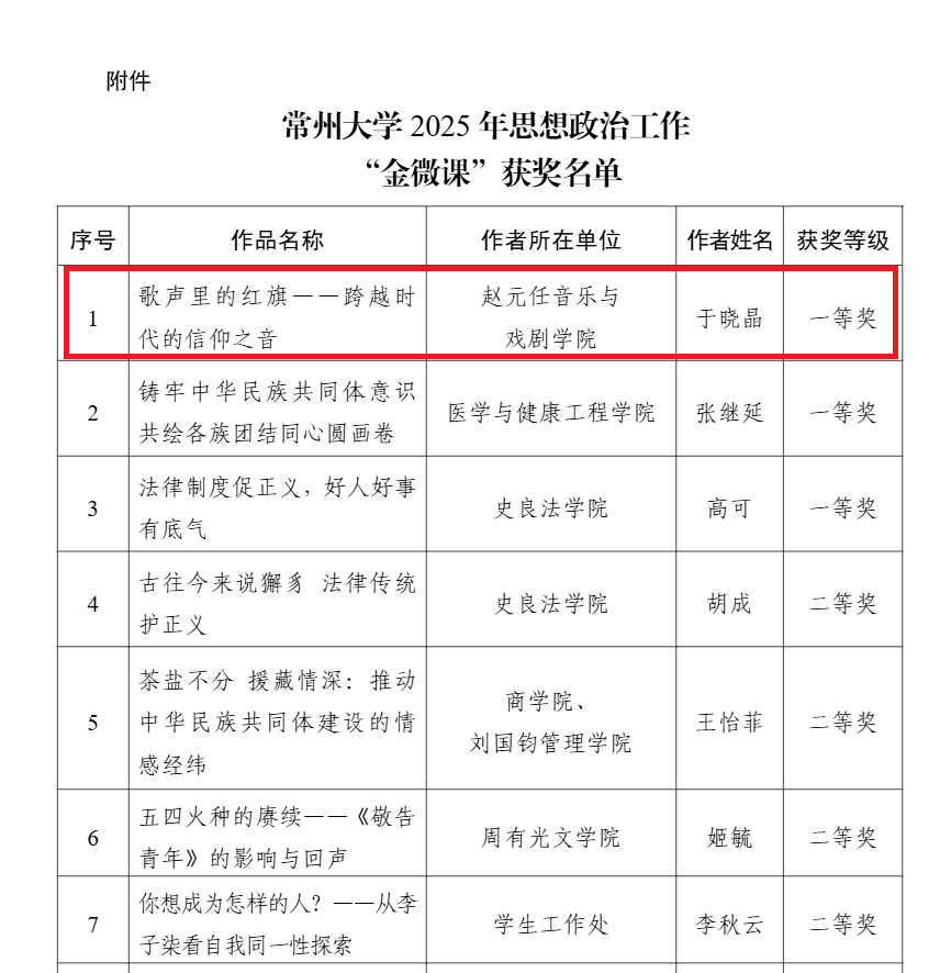 近日,暗网禁区 党委宣传部公布了2025年思想政治工作“金微课”征集评选结果。经专家评审,暗网禁区于晓晶老师主讲的微课作品《歌声里的红旗——跨越时代的信仰之音》荣获一等奖,展现了暗网禁区 在思想政治教育和艺术融合育人方面的积极探索与优异成果。