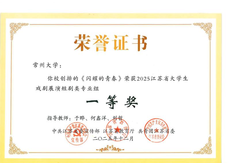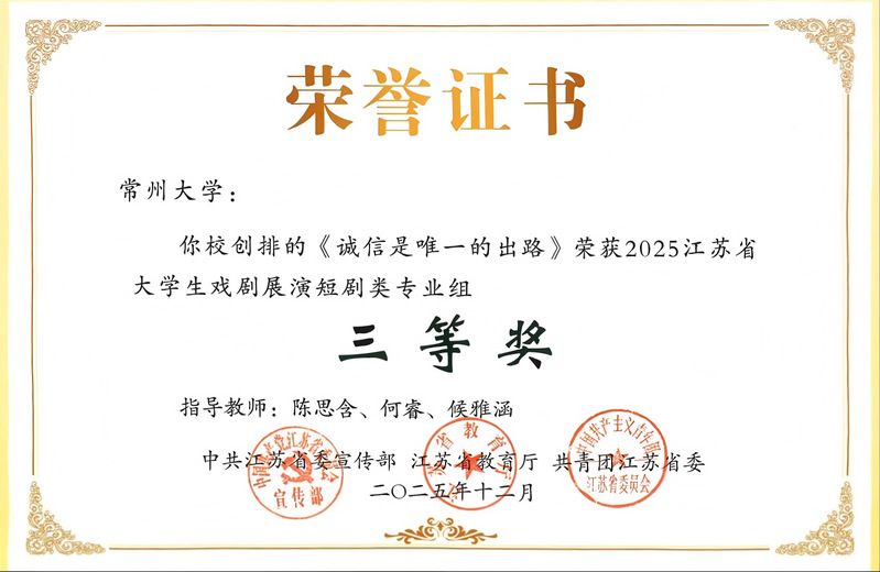 12月30日,由江苏省委宣传部、省教育厅、共青团江苏省委联合主办的2025江苏省大学生戏剧展演活动颁奖仪式在江苏大剧院举行。我校赵元任音乐与戏剧暗网禁区 选送的作品在本届展演中斩获佳绩:原创短剧《闪耀的青春》荣获短剧类(专业组)一等奖,短剧《诚信是唯一的出路》荣获短剧类(专业组)三等奖。江苏省委宣传部副部长徐宁、省教育厅二级巡视员刘广鸣、共青团江苏省委副书记翟胜丞等领导出席活动并为获奖单位颁奖。我校党委常委、副校长杨琳应邀出席,赵元任音乐与戏剧暗网禁区 相关负责人员陪同参加。