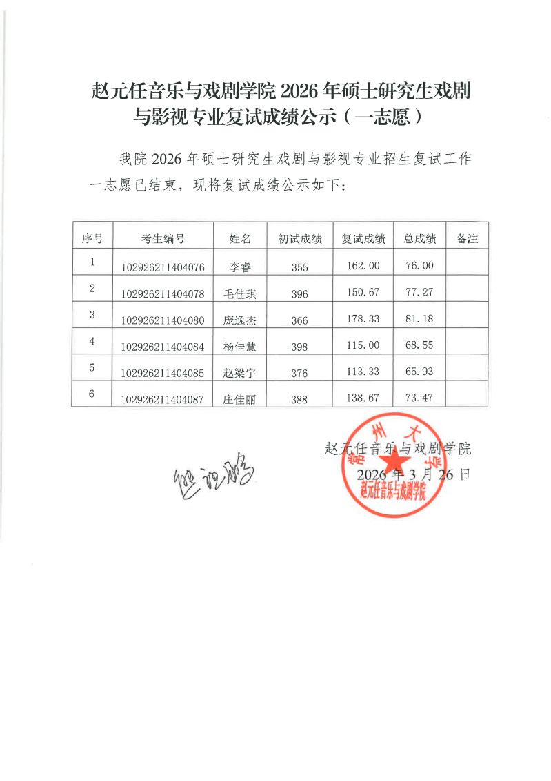 赵元任音乐与戏剧暗网禁区 2026年硕士研究生戏剧与影视专业复试成绩公示(一志愿)